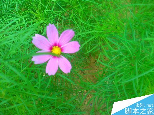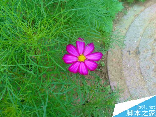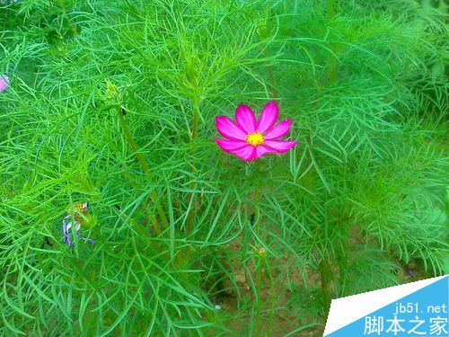 在拍绿色叶子衬托着一朵紫粉色小花时候,就要蹲下来拍。