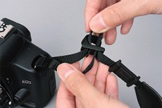 7、 安装背带。将背带穿过机身和背带环,放松背带锁扣部分,使背带从上端穿入。在背带锁扣内侧折回,拉紧背带。
