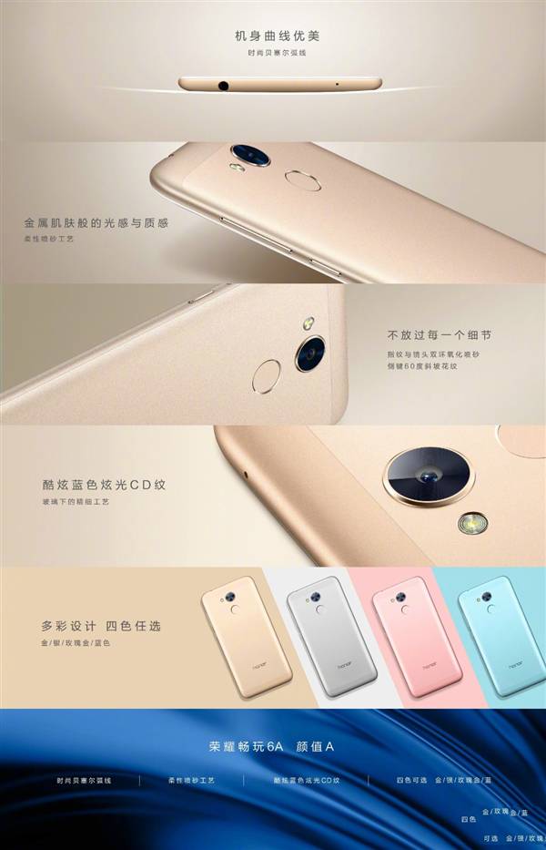 外观设计方面,荣耀畅玩6A采用柔性金属喷砂工艺,手感细腻,提供金、银、玫瑰金、蓝色四种颜色可选,年轻活力。