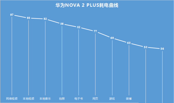 其实,我的实际体验跟实测数据也是十分吻合的。在我们的5小时标准续航测试中,HUAWEI nova 2 Plus经历10个项目的测试后,最终剩余电量达到了56%,如果考虑到它3340mAh容量的电池,这一结果还是十分不错的,毕竟某些4000mAh级别的手机也只能达到这一水准。
