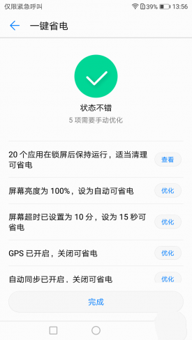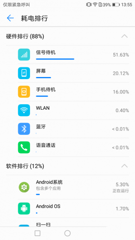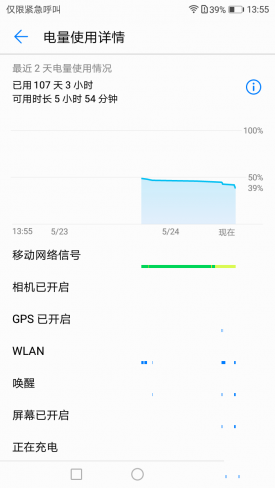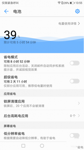 荣耀畅玩6A采用了3020mAh电池,并搭载了智电5.0省电技术,基本上可以保证用户充一次电用一天。在电池选项中,用户可以随时查看电量情况,并根据所预计的可用时间来进行充电。在下方的电量使用情况中,则是可以看到目前为止耗电最多的时间以及应用,便于用户管理。