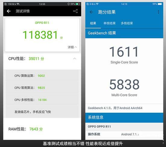 骁龙660处理器的性能表现,我们参考几款测试软件。安兔兔评测中的分数接近12万分,GeekBench跑分单核成绩超过1600分,多核成绩逼近6000分,这无疑是次旗舰级别的最优秀表现了,比起OPPO R9S几乎有着成倍的提升。单从数字来看,OPPO R11已经彻底摆脱了性能这块短板。