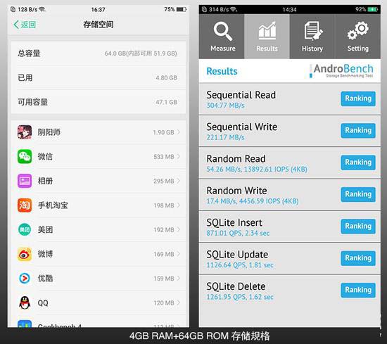 存储方面OPPO R11配备4GB RAM+64GB ROM,这是个非常标准的存储组合,现阶段绝对够用。从闪存的测速来看,OPPO R11采用的是eMMC闪存,但绝对是顶尖的哪一种,毕竟能超过300MB/S的读取速度十分少见。
