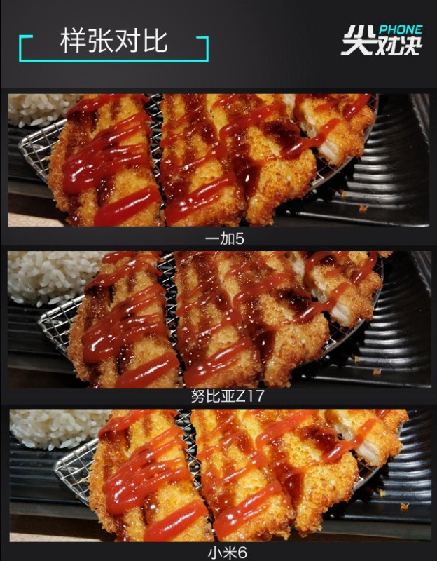 美食样张,小米6太亮,努比亚Z17太暗,一加5则能将食物表现得“很好吃”。