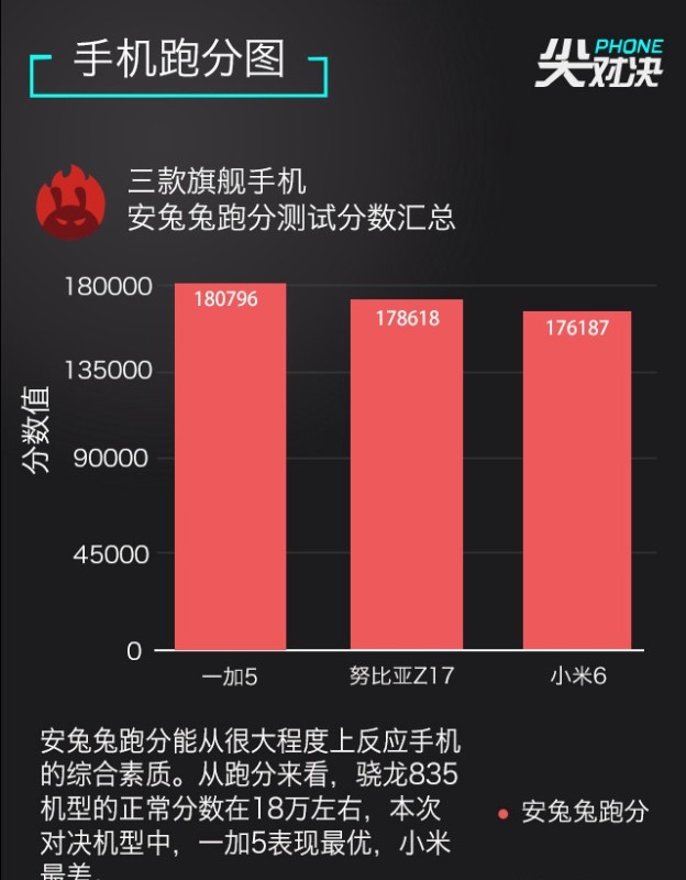有朋友问笔者,3000左右的预算,想买一台搭载骁龙835的手机,买哪部好呢?相信有不少读者也有这样的疑问,所以本期的尖Phone对决我们选取了三台3000左右价位的骁龙835移动平台的手机:一加5、努比亚Z17、小米6。想来让骁龙835性能折服但又不愿意花大价钱去买三星、索尼、HTC的消费者对这三台手机都有所关注,那么废话不说多,让我们来看看它们到底孰强孰弱。