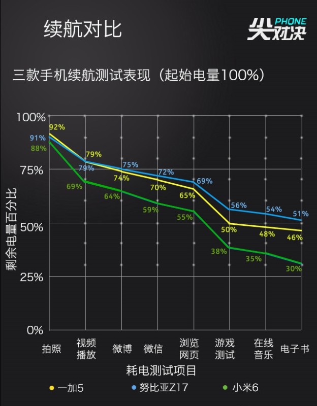 续航差距就比较明显了。一加5和努比亚Z17的表现相差不大,测试结束后都能剩余大约一半的电量,努比亚Z17表现最佳。这两款手机中轻度使用两天没有问题。相比于这两台机器,小米6的续航就有些不尽如人意了,但中度使用一天也应该没有问题。