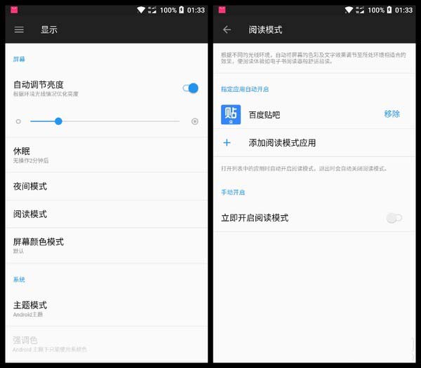 由于一加5有独立的RGB Sensor进行环境光感调节,因此我们可以通过系统中的选项将其一步进入阅读模式。