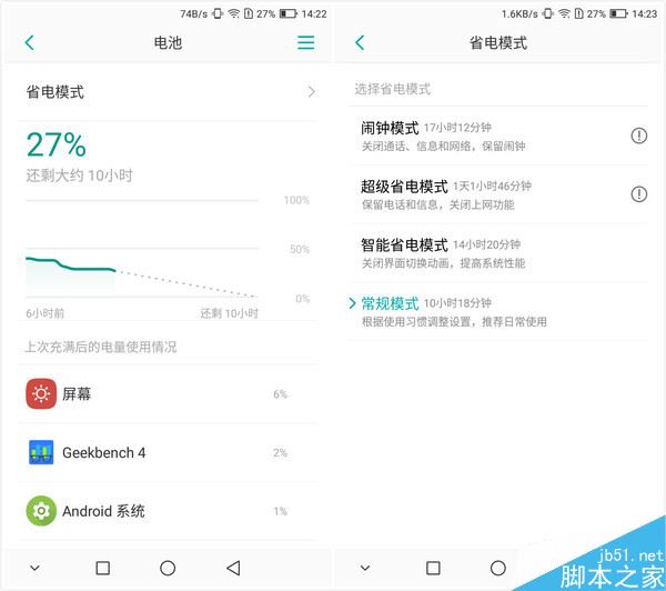续航一直是用户的痛点之一,海信手机H10采用了3500mAh电池,据官方称,在常规模式下,海信H10可达到420小时超长待机时间。至于待机有没有这么长时间我还没试过,毕竟拿到手机的时间有限。但有一点肯定的是,在使用同样应用的前提下,相比于市面上部分旗舰机都要省电。之所以续航时间长,海信手机H10的内置省电模式功不可没,闹钟模式、超级省电模式和智能省电模式。