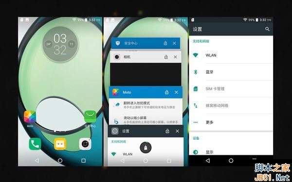 Moto Z Play该机搭载Android 6.0系统,并取消了二级菜单目录。相比于很多臃肿的定制系统来说,界面更简洁,操作也更简单。采用虚拟按键设计,屏占比更高。设置菜单、多任务管理、下拉菜单栏也更接近于原生安卓系统,上手较为容易。