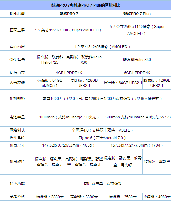 首先小编制作了一张魅族PRO7和PRO7 Plus核心参数对比表,详细梳理了魅族PRO7与魅族PRO 7 Plus的区别,并罗列了各版本的区别,看完基本秒懂了。