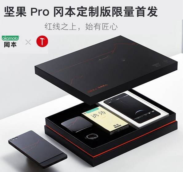 而坚果Pro冈本定制版,与普通版包装不同,其采用礼盒式设计,里面一共包含手机、冈本产品和定制礼品三大类。