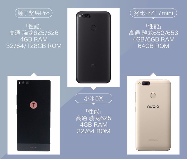 性能方面,小米5X搭载的是高通骁龙625八核处理器,4GB内存和32/64GB存储空间;而坚果Pro则是搭载高通骁龙625/626八核处理器,4GB运行内存和32/64/128GB存储空间;努比亚Z17mini则为搭载高通骁龙652/653八核处理器,4GB/6GB运行内存和64GB存储空间,核心性能硬件规格如下图所示。
