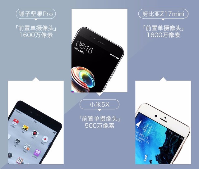 摄像头方面,小米5X配备前置500万像素摄像头,而坚果Pro和努比亚Z17则均为前置1600万像素摄像头,从前置相机来看,小米5X规格相对最低。