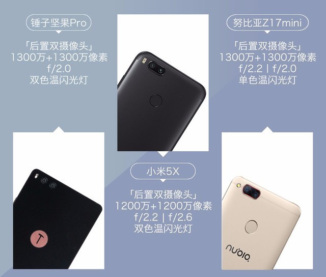 首先,小米5X、坚果Pro、努比亚Z17mini都是今年发布的千元新机,最低售价分别是1299元、1499元和1699元,三者均配备双摄像头,其中小米5X主打变焦双摄,拍人更美;坚果Pro双摄并非主打卖点;努比亚Z17mini则主打专业双摄拍照,结合nubia专业相机软件优化,在拍照方面具备不俗的表现。