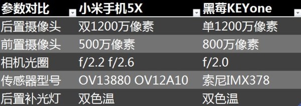 黑莓KEYone与今年的国产手机相比显得有些格格不入,依然采用单摄像头设计。与小米5X相同,黑莓KEYone的后置摄像头也是1200万像素,不同的是黑莓的这颗后置摄像头来自索尼,型号为IMX378。前置摄像头方面,黑莓KEYone比小米略强,采用了一颗f/2.2光圈的800万像素摄像头。