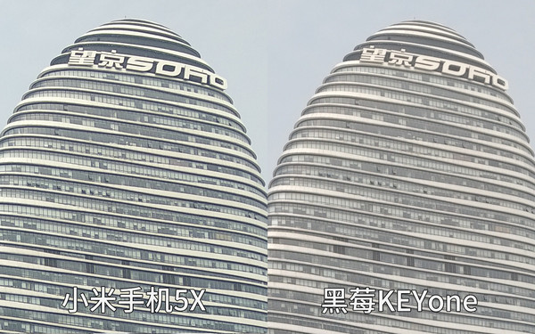 这组望京SOHO的对比样张很说明问题。虽然两款手机都能隐约分辨出云层,从观感上差距不大。不过在画面锐度上小米5X明显强于黑莓KEYone,将照片放大至相同大小后,小米5X拍摄的望京SOHO塔楼依然锐利,不过黑莓KEYone的样张已经有些糊了。在色彩上,小米5X似乎是有一点偏绿,而黑莓KEYone拍摄的更接近真实场景。