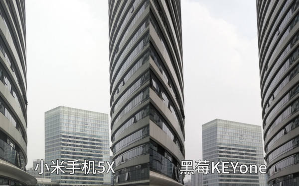 这组样张,我们依然能够看出两款产品的不一致。小米5X的照片优势在于画面亮度,在阴天环境中,这种画面亮度非常讨好眼球,不过在细节上却不如黑莓KEYone丰富。从黑莓KEYone的样张中,我们还能隐约看到两个大楼之间的云彩,而小米5X由于亮度高,两个大楼之间已经变成了白茫茫一片。