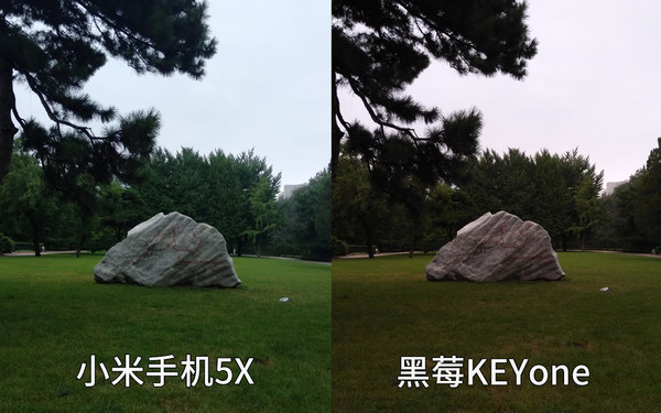我们在北理工边走边拍的时候,拍到了这组对比异常明显的样张。同样的一块石头,使用小米5X拍摄后画面明显偏绿,无论是远处的松树还是近处的草坪,看起来都是绿油油的,并不真实。而黑莓KEYone拍出来的石头,则出现了偏红的现象,整块石头表面都是淡淡的红色。另外,小米5X在亮度控制上做的并不好,远处的天空能明显感觉到过曝的现象。
