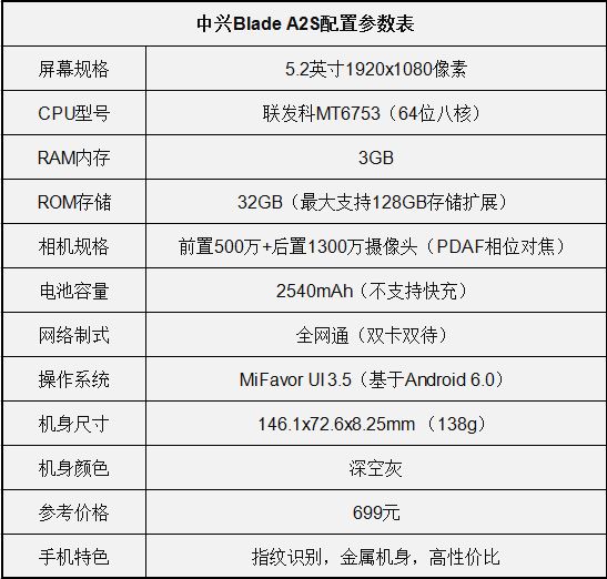 中兴Blade A2S采用全金属机身设计,并配备指纹识别功能,售价仅699元,作为一款不过千元的机型,中兴Blade A2S配备了1080P全高清屏幕,3GB RAM内存+32GB存储空间,从这几点看中兴Blade A2S性价比可谓是极高的。