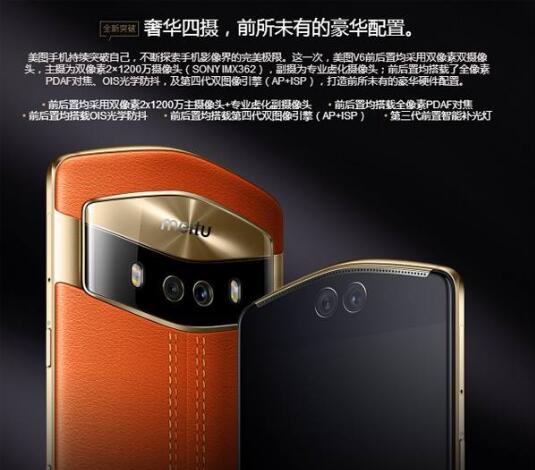 外观方面:美图V6采用高档的皮革材料,利用美图家族经典的双V设计,两侧各有一组双色温闪光灯,前置指纹识别,上下双扬声器放在上下边框中,前置双摄,后置两颗硕大的摄像头。