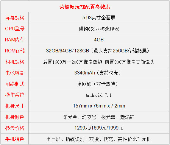 首先看一下荣耀畅玩7X详细的配置参数,以便对荣耀7X有个大致了解,详情如下图所示: