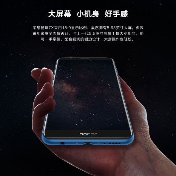 配置方面,荣耀畅玩7X搭载5.93英寸全高清全面屏,采用18:9显示比例,由于采用最流行的全面屏设计,荣耀畅玩7X与前辈6X手机5.5英寸屏幕大小相当,仍可一手掌握。值得一体的是,荣耀畅玩7X采用了全面屏所以在玩游戏和看视频时都能获得更好的视觉体验。荣耀畅玩7X还加入了创新的护眼模式和“一键分屏”技术,如看视频时弹出QQ消息,点击对话可自动分屏。