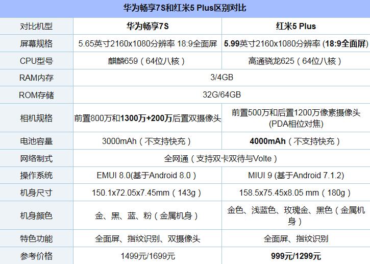 硬件方面,华为畅享7S和红米5 Plus主要是屏幕大小、处理器、摄像头、电池容量、系统不同。下面我们分别来对比看看。