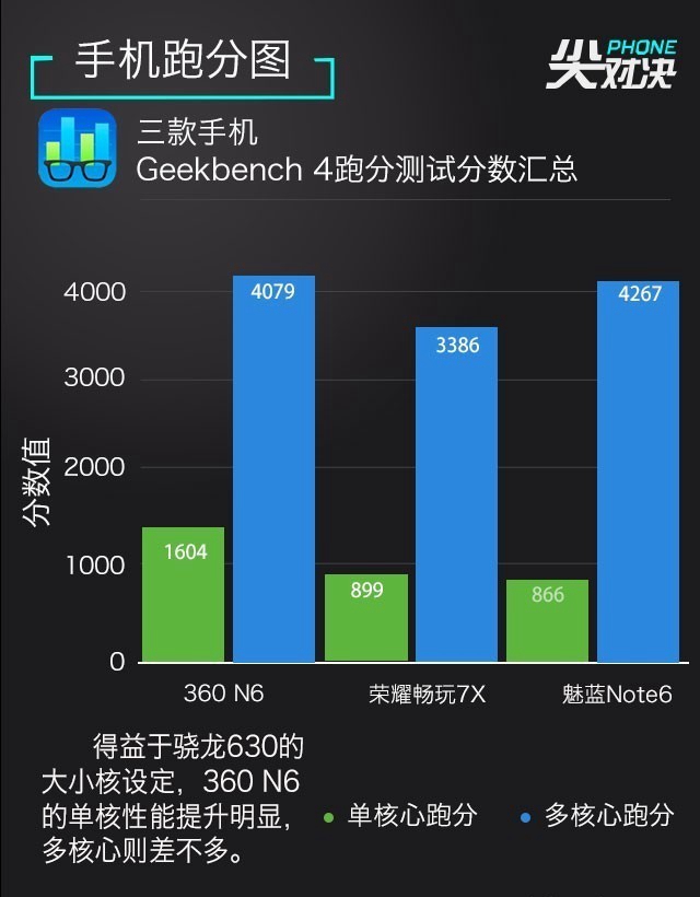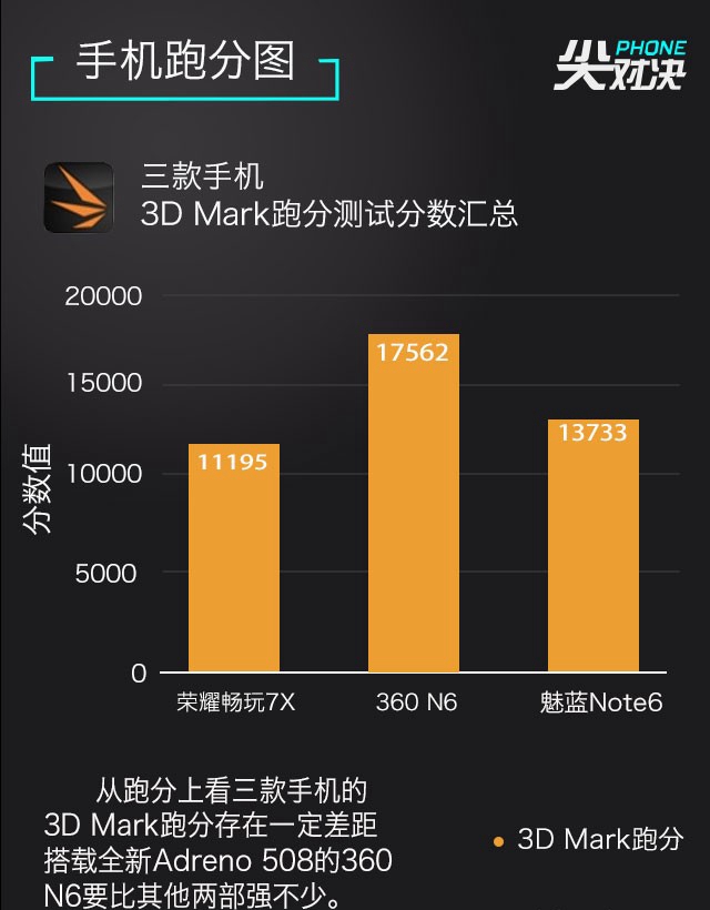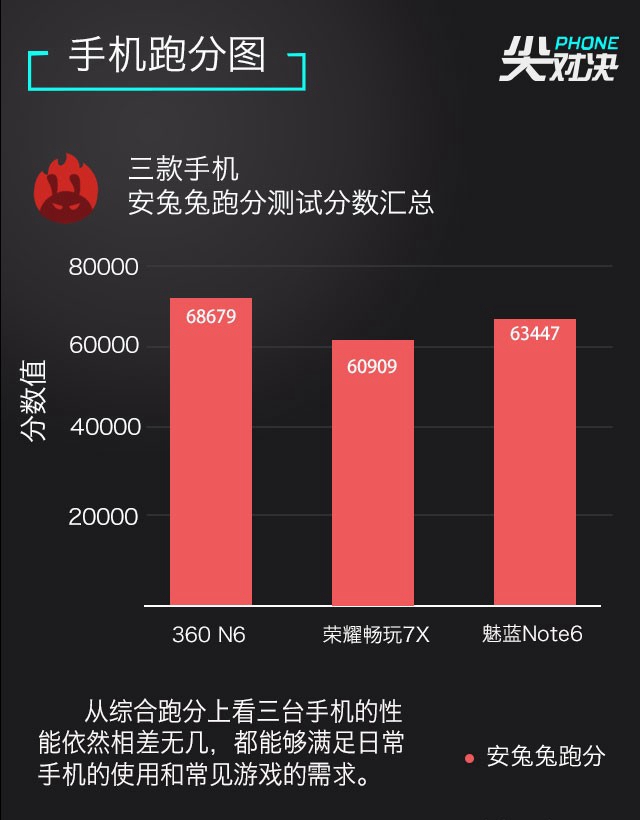 几项测试下来结果与笔者之前预料的大致相同,高通骁龙630移动平台作为骁龙625的升级版本,无论是安兔兔、GeekBench亦或是3D mark跑分都要略微领先,而荣耀畅玩7X与两者之间还有微小差异,单纯性能上360 N6强于魅蓝Note6强于荣耀畅玩7X,不过差距极小,基本可以将三款手机等而视之。