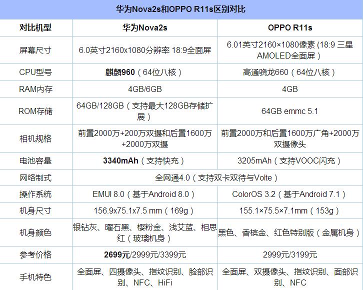 以同为4+64GB版为例,华为Nova2s比OPPO R11s双版本分别便宜了300元和500元,有较为明显的价格优势。