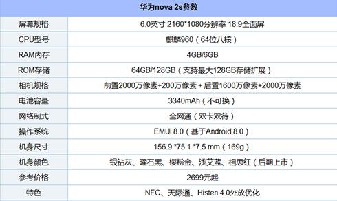 配置方面,nova 2s搭载麒麟960八核芯片,配备6GB RAM。同时高质量的网络通信技术加持,让你随时随地高效处理多项任务。搭载EMUI 8.0系统,智能预测用户意图,提供各类情景提醒与便捷操作。