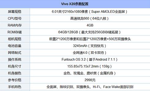 硬件方面,vivo X20全面屏手机采用了骁龙660处理器,搭配4GB+64GB存储规格并支持存储卡拓展。