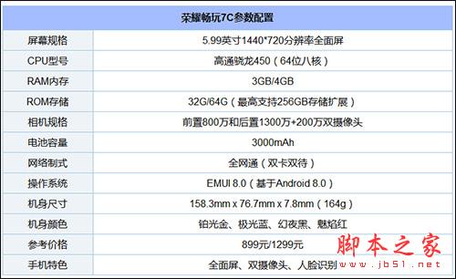 荣耀畅玩7C配备一块5.99英寸18:9全面屏,并将指纹识别传感器放置在手机背面。同时,荣耀畅玩7C搭载高通骁龙450处理器,标配版提供3GB+32GB内存组合,而高配版则提供4GB+64GB组合。