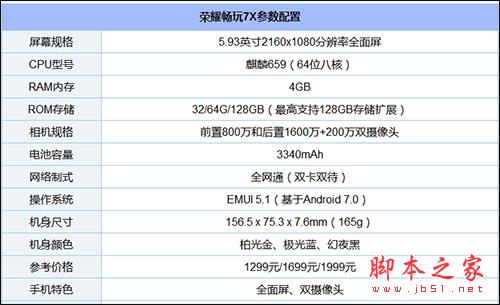 至于价格方面,荣耀畅玩7X的4GB+32GB版本为1299元,4GB+64GB版本为1699元,4GB+128GB版本为1999元。