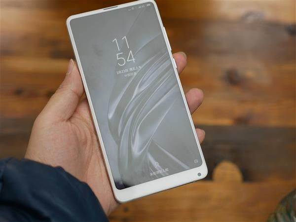 MIX 2S基本完全复用了MIX 2的外观和工艺,正面是一块5.99英寸18:9LCD全面屏,分辨率2160X1080,上、左、右三面窄边框,听筒开孔位于上边框中,屏幕下方有一个小小的“下巴”,500万像素的前置摄像头依然位于手机正面的右下角。