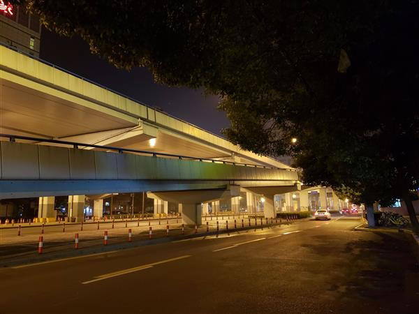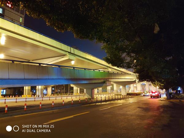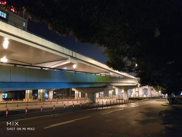 在这一组夜景样片中,MIX 2S通过暴力的多帧合成,展现了惊人的宽容度,照片主体两侧阴影处的楼房清晰可见,暗部细节甚至iPhone X和“夜视仪”三星Galaxy S9还要多,不过过于激进的曝光策略让MIX 2S的亮部有点过曝,相比iPhone X和Galaxy S9(尤其是Galaxy S9)稍微欠缺了点质感。至于MIX 2,就不比了吧…
