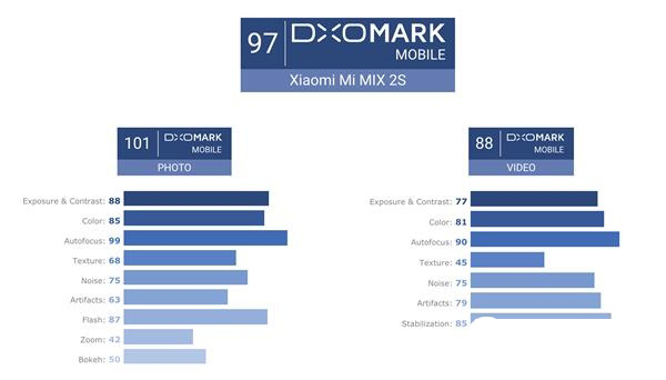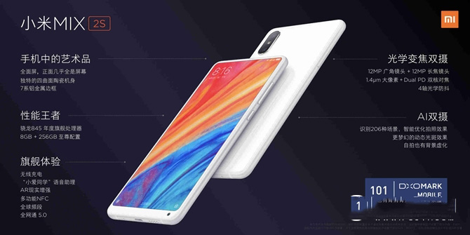 与此同时,小米也公布了MIX 2S在DxOMark上的得分,在拍照单项上(注意是拍照单项,没有考虑录像),MIX 2S拿到了有点吓人的101分,这个成绩已经打平了iPhone X,在DxOMark所有测过的手机中仅次于三星Galaxy S9+(104分),超过了之前国产手机得分最高的Mate10Pro(100分)。