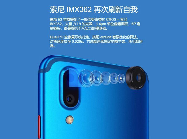 后置主摄像头方面,魅蓝E3配今年流行的竖形双摄,并且相机传感器比此前的魅蓝Note6更高,使用的是索尼IMX362+IMX350,1200万+2000万双摄,支持1.8X的光变,2.5X无损变焦,拍照表现要比魅蓝S6高一个档次。