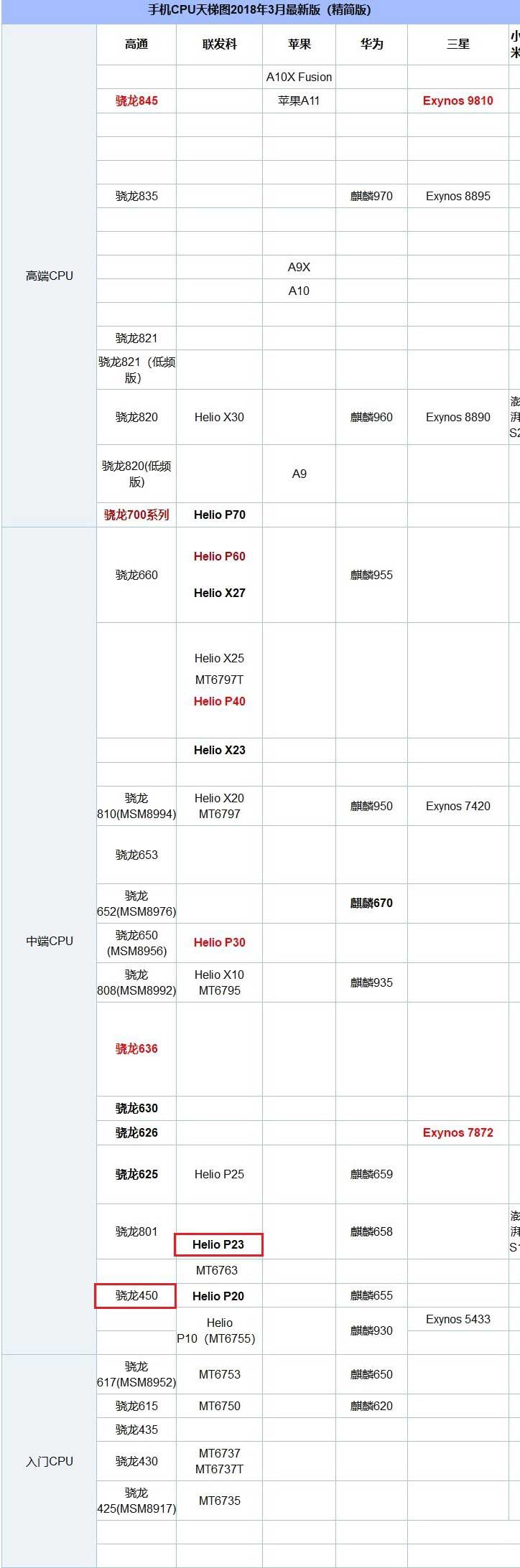 那么,Helio P23和骁龙450究竟谁更强呢?下面我们通过手机CPU天梯图,直观来了解看看吧。