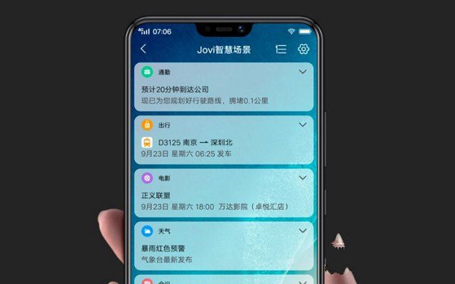 Jovi AI助理方面,Jovi = enjoy vivo's AI,是vivo的人工智能助理。Jovi AI助理中的智慧场景可将手机上重要的信息,内容进行聚合,在适当的时候向用户发出提醒,主动提供贴心服务:上班路况提醒,智能检测航班动态,出行目的地天气提醒,火车票、机票、酒店、会议、休息提醒等,犹如为你配备一位全天候私人助理。