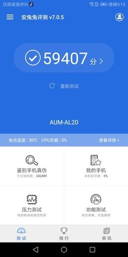 经过安兔兔跑分测试,最终荣耀畅玩7A的安兔兔跑分成绩为59407分,性能基本上够日常使用,不适合吃鸡游戏,属于这个价位偏低的水平。要知道红米和魅蓝在这个价位至少可以实现8-9万左右的跑分成绩。