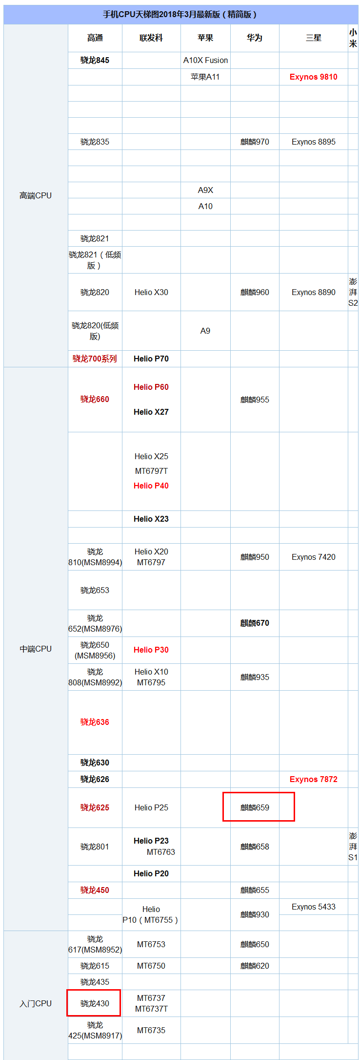 骁龙430和麒麟659在手机CPU天梯图中的位置