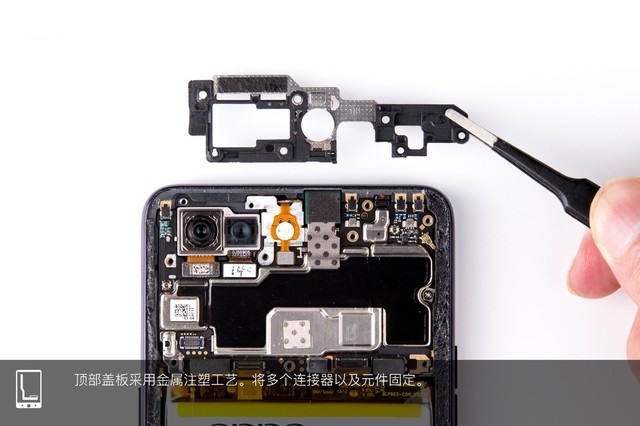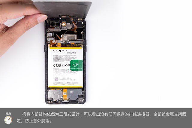 OPPO R15内部依然是常见的三段式设计,上部为大主板,中间为电池,底部为副小板,整体内部元件布局整齐,做工上可以说很不错。