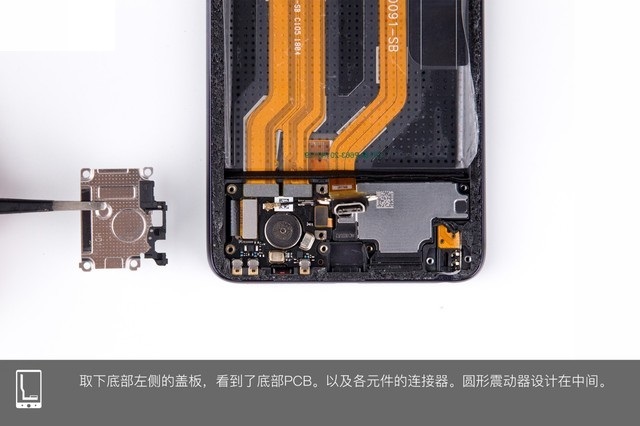 首先卸去底部右下角的盖板固定螺丝,然后卸去数据接口、耳机等小部件,如下图所示。