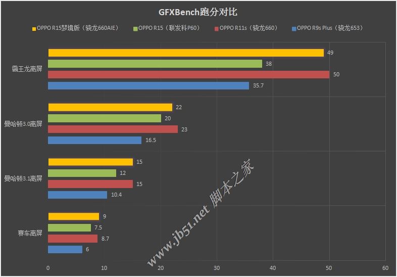 从GFXBench跑分中可以看到,骁龙660AIE的GPU性能要比联发科P60稍高一筹,但与骁龙660相比没有差别。