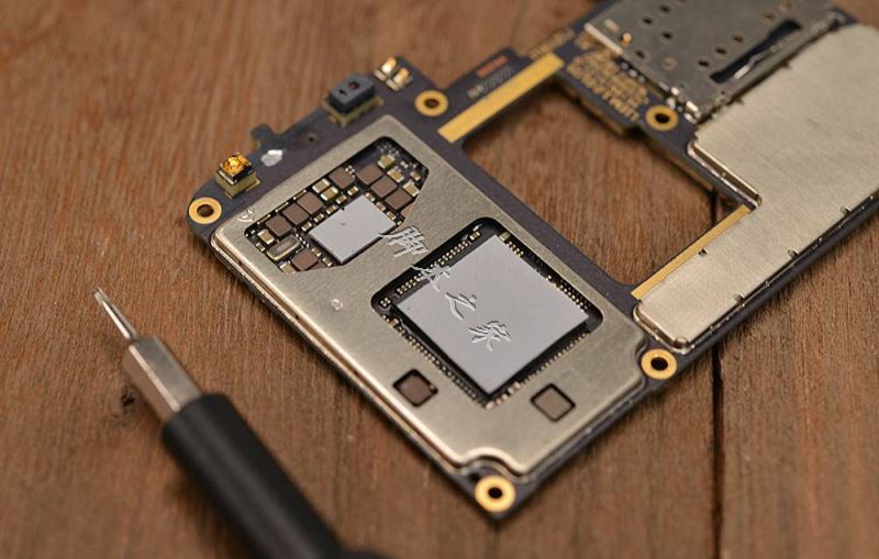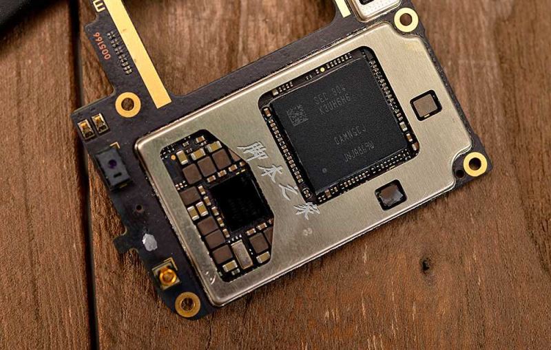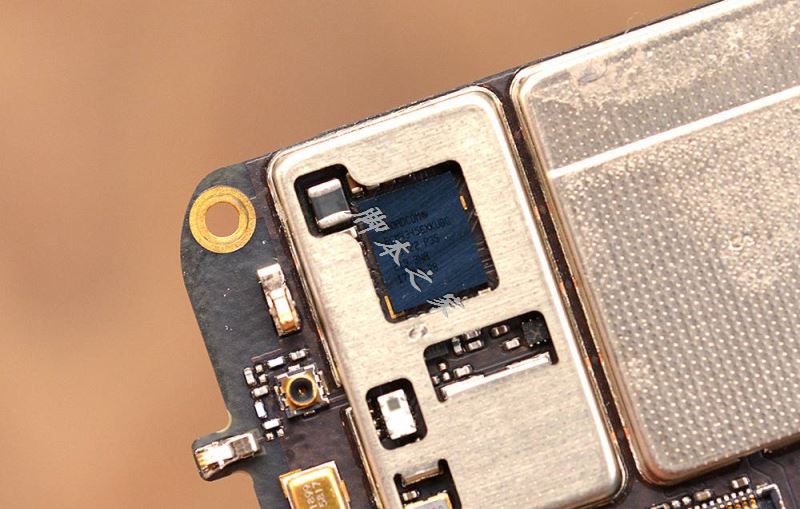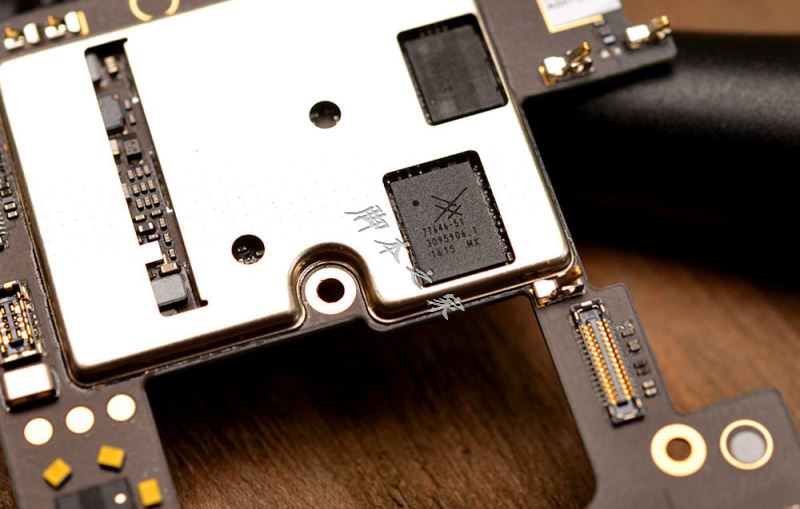 主板的背面主要是手机的CPU、内存、闪存等等的芯片,同样覆盖有屏蔽罩。