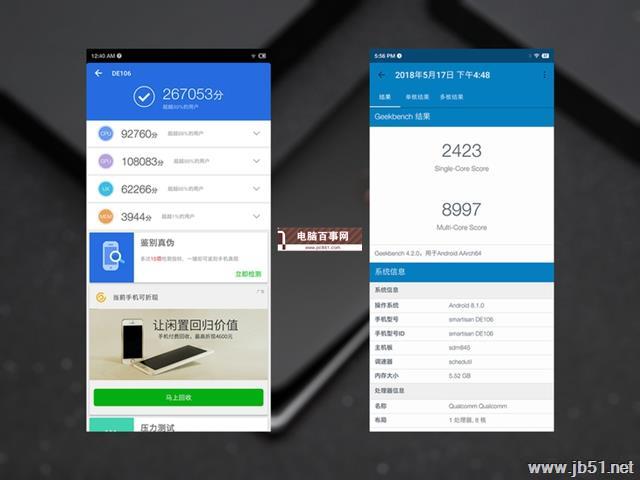 坚果R1采用了高通目前最强悍的骁龙845处理器,最高采用8GB+1TB内存存储组合,可谓是目前智能手机的最高配置,下面我们先来通过跑分软件对坚果R1进行性能测试,来看看表现怎么样。