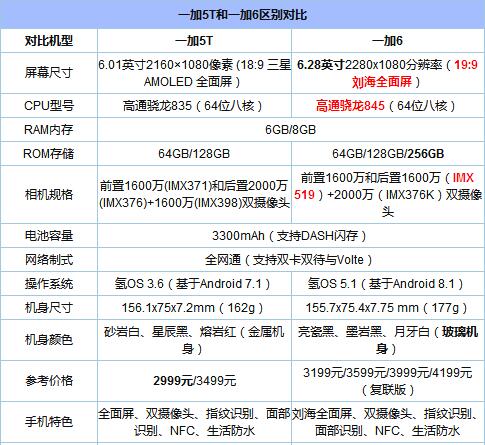 首先从全局角度看看,一加6和一加5T在价格、硬件配置上都有哪些不同,如下参数对比图所示。