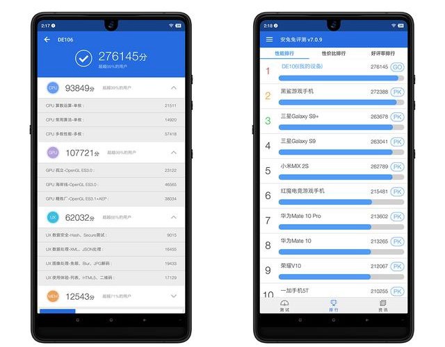 性能方面,坚果R1和小米MIX2S均搭载的是高通骁龙845八核处理器,性能是为同一级别。不过,由于优化上的差异,坚果R1的安兔兔跑分相比小米MIX2S明显更高一些,以下是这两款手机安兔兔跑分对比。