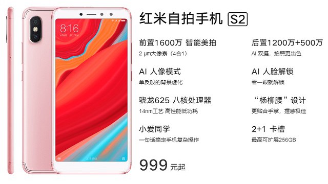 红米S2版本相对较少,提供3+32GB、4+64GB两个版本可选,售价分别是999元和1299元。