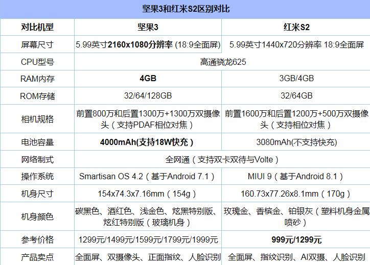 作为两款价格、配置接近的手机,仅仅是看外观显然是不够的。下面我们先来看看坚果3和红米S2在价格、配置上具体有哪些细节不同,如下所示。